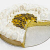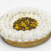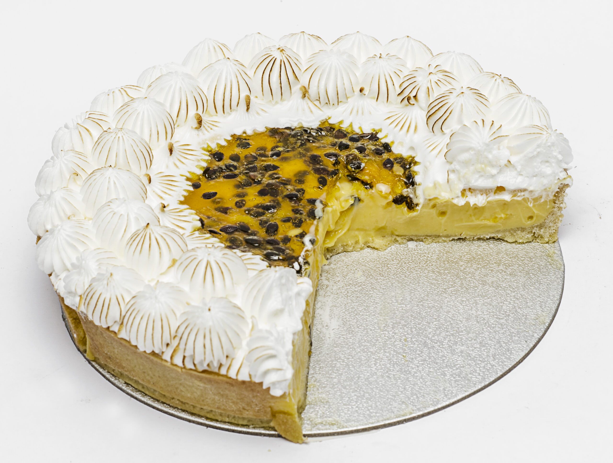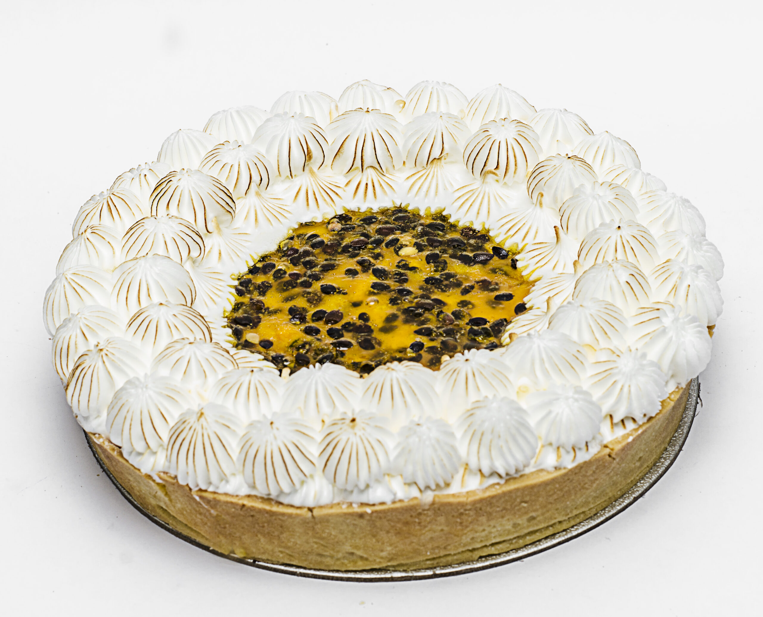 Delgada masa con crema de maracuyá y cubierta de merengue italiano